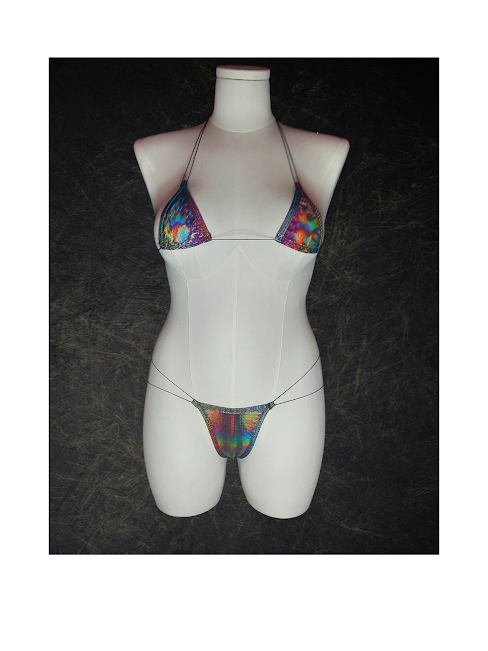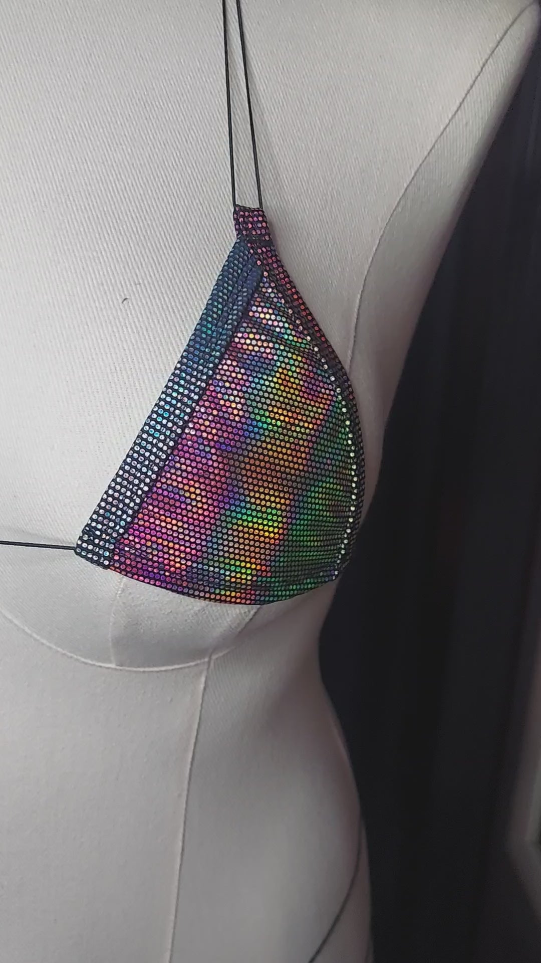 All eyes on you, babe. This black holographic bikini set is pure magic—catching light from every angle with an insane iridescent shimmer that shifts as you move. This ultra-skimpy 2-piece features skinny elastic strings that highlight your curves while keeping things strappy, minimal, and irresistibly hot.